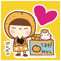みかん色のワンピースでご機嫌なことちゃん。白猫のみみちゃんといっしょに大好きなミカンに変身したり。白い縁取りで、どんな背景でもはっきり見えます。