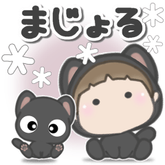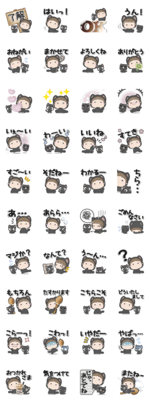 言葉短め・大きめ文字で使いやすい。 黒猫の着ぐるみの魔女見習いまじょると黒猫のコンビがほのぼのするスタンプです。ぽてこ より発売