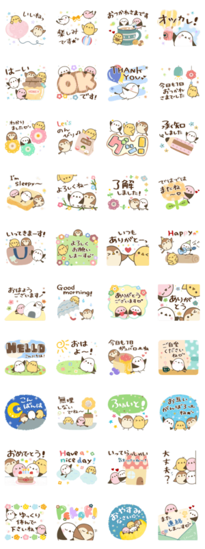 落ち着いた色合いで大人の方も使いやすい小鳥キャラ大集合の見やすいスタンプ第2弾です。毎日使える丁寧でやさしい言葉の誰にでも送りやすい基本セットになっています。