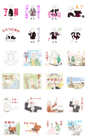 喜怒哀楽ゆたかな作曲家のスタンプでお話しよう! イラスト:千原櫻子 音楽之友社刊 新井鷗子著『音楽家ものがたり』シリーズより音楽之友社 より発売