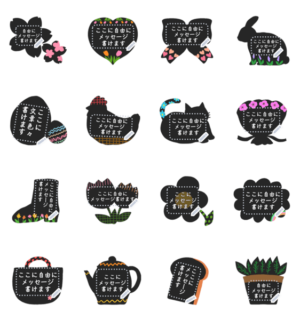桜やイースター・チューリップ・ウサギ・猫・鶏・鞄・ティーポット・パンなど黒地にカラフル線画が大人可愛いフレーム♥文章が自由に書ける♡春メッセージスタンプ特集♪ 現在この商品は一部のスマートフォン版LINE 10.3.0以上のトークルームでのみ使用できます。動作環境の最新情報はヘルプをご確認ください。れなし より発売