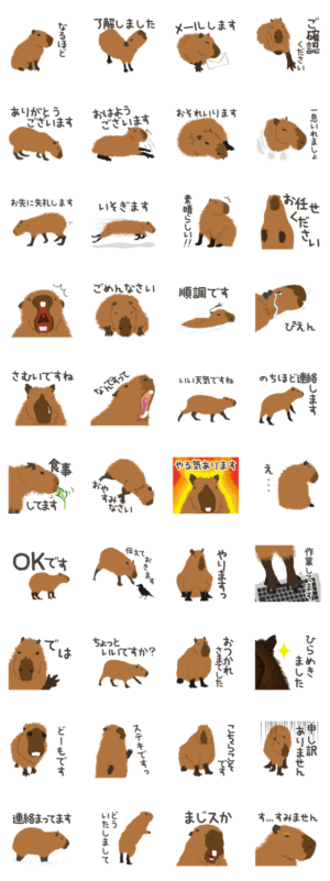 可愛らしさは控えめです。ビジネスシーンでも使うこと目指したカピバラのスタンプです。 Loveカピバラ。tepay より発売