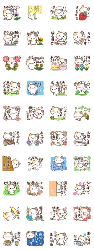 『小さい三毛猫』の『着せかえ』と『絵文字』もあります!春の花と、明るい雰囲気の、ずっと便利に使えるミケネコスタンプ。かわいい、みけねこ好きな方にぜひ。【かたこ】かたこ より発売