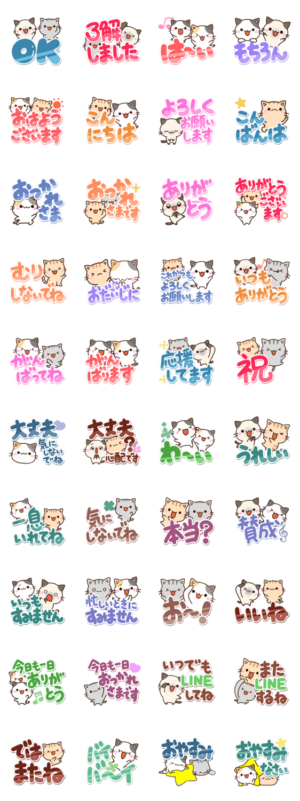 『ちびブチ』『ちびシャム』『ちびトラ』『ちびミケ』『ちびアメ』の絵文字もあります!『5匹のちび猫』のカラフルで大きい文字のネコスタンプ。毎日使えます。【かたこ】