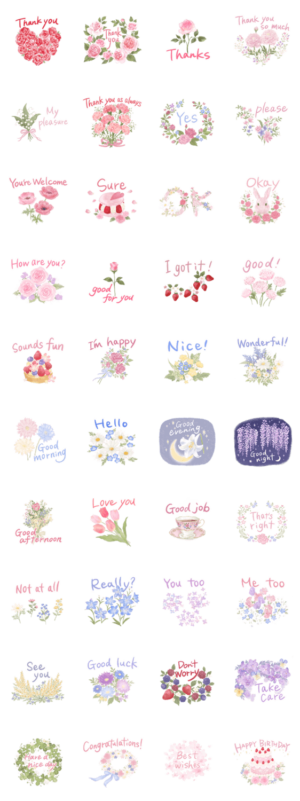 日常で使える感謝や挨拶などに、お花を添えて。大人でも使いやすい、一年中使える英語のスタンプです。