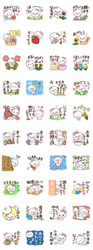 『しろりぼん』の『絵文字』と『着せかえ』もあります!リボンを付けた可愛い『しろりぼん』の春の花のスタンプ。誰でも使えるかわいいスタンプです。【かたこ】かたこ より発売