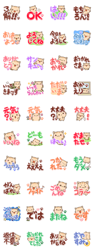 とらねこの『ちびトラ』の、絵文字と着せかえもあります。カラフルで大きな文字の虎猫スタンプ。よく使うあいさつ等もあるネコスタンプです。【かたこ】かたこ より発売