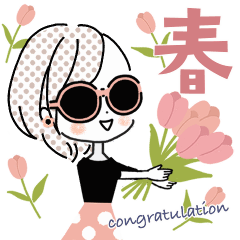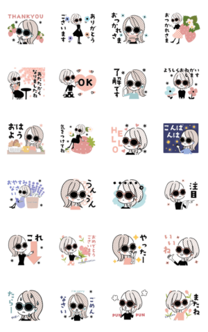 サングラスの女の子の春いっぱいの大人ガーリースタンプです。あいさつがたくさん入っている毎日使いやすい可愛いスタンプです。