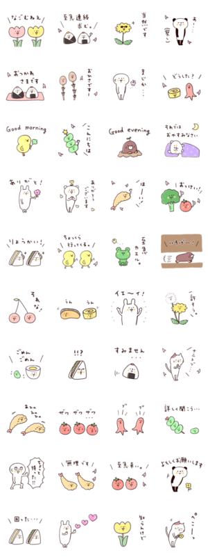 春イメージのぼくとクマとお弁当の中身や春の仲間たちの花びら舞うスタンプセットです。うさぎ/パンダ/おにぎり/サンドイッチ/ウィンナー/それな/知らんけど/カジュアル/桜