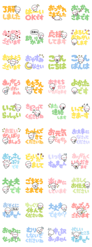 しろまるのデカ文字スタンプです。文字が大きいので選びやすく見やすいスタンプで、毎日使える内容を厳選し作成しました。【作:いしいともこ】