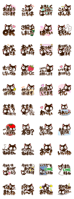 『小さい黒猫スタンプ』の大きくて目立つ、でか文字クロネコスタンプです。毎日のあいさつもあります。くろねこ好きな方にぜひ。絵文字も着せかえもあります。【かたこ】