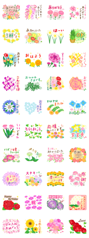 よく使う言葉や挨拶など毎日使えるお花のスタンプです。色とりどりの花やグリーンの植物とともに優しく爽やかなコミュニケーションを♡sorahanaland より発売