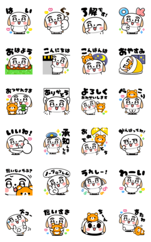 いつも元気な犬の『大福ちゃん』とぬいぐるみの『気楽クマ』の可愛い挨拶スタンプ。毎日使える定番の挨拶と返事が揃ってます♪文字が大きめで使いやすい飛び出すスタンプ!