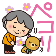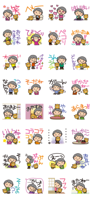 優しくてキュートなばぁばと子犬のスタンプ。大きい文字で使いやすいスタンプです。