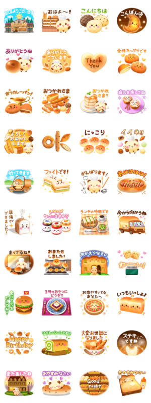 パンが大好きなあなたへ。出来立てほやほやのパンが詰まったスタンプです!お腹を空かせている方へいろいろなパンを届けてお腹いっぱいにしてあげましょう!すみれぐみ より発売
