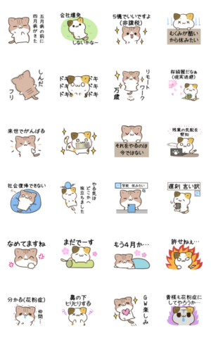 お疲れ気味 やる気が出ない時に使えるゆるかわ三毛猫とキジトラ白猫のアニメーションスタンプ第13弾 仕事 体調不良 春夏秋冬 花粉症 GW 学校 遅刻 むくみ 桜 花見 残業