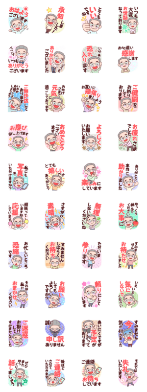 元気なおじいちゃんの大きなスタンプです。毎日使える丁寧語の挨拶セットです。(おじいさん/じぃじ/爺/父/男/敬語/日常/高齢/シニア/デカ文字/会社/仕事/サラリーマン) ※このスタンプはトークルームで大きく表示されるBIGスタンプです。あかずきん より発売