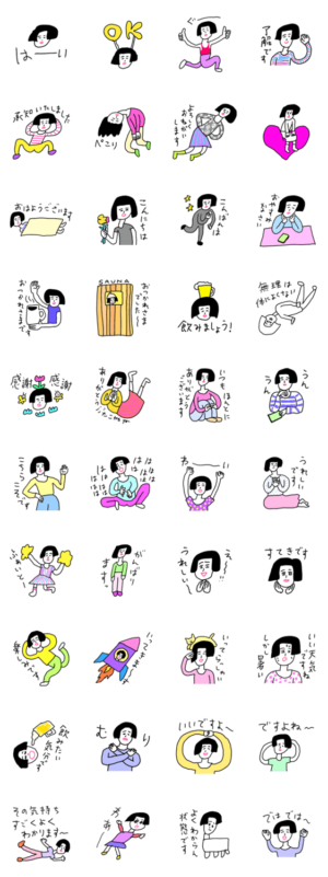 元気で明るい毎日使えるシュール女子スタンプです。挨拶や敬語丁寧語たくさん入ってます。イッレ・コスヤ より発売