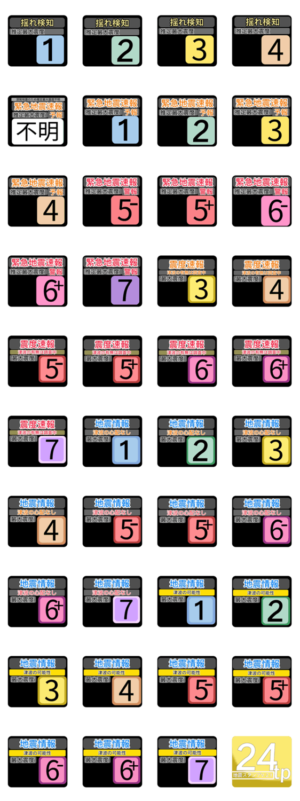 地震情報24tp推奨スタンプ・揺れ検知1〜4・ 緊急地震速報 不明+1〜7・地震情報1〜7・震度速報3〜7・地震情報(津波の可能性)1〜7・UD配色・フォントで作成しています