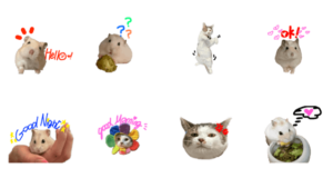まるやまさん家のおもちさんのスタンプです。表情が乏しいので、よねくぼさん家のちっちさんに友情出演していただきました。