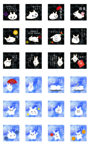 ゆるいシンプルなうさぎのふにゃらびシリーズ、空の背景が動くエフェクトスタンプ。2023年(令和5年)の干支はうさぎ年(卯年)うどんみかん より発売