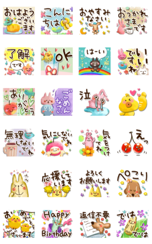 癒し系ふんわりスタンプ。敬語/猫/ねこ/うさぎ/犬/鳥/ひよこ/デカ文字/基本/挨拶/動く/家族/丁寧/かわいい/山田まぽん作。