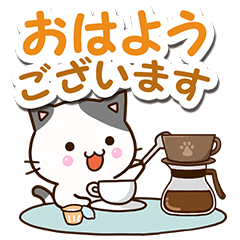 白とクロのブチねこスタンプ。「おはよう」から「おやすみ」までの基本的なあいさつや、ていねいで便利な敬語いっぱいの猫スタンプです。【かたこ】かたこ より発売