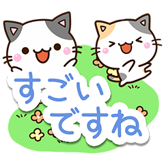 ちいさい三毛猫の『ちびミケ』と、かわいいぶち猫の『ちびブチ』。丁寧な言葉の便利なネコスタンプ。学校やお仕事、会社やママ友等、みけねこ好きな方にぜひ。【かたこ】