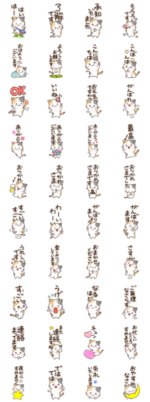 『お茶目な三毛猫』の、毎日使える、みけねこBIGスタンプです。ずっと使えて便利なスタンプ。ミケネコ好きな方にぜひ。【かたこ】あいさつ/お仕事/学校/ママ友/かわいい ※このスタンプはトークルームで大きく表示されるBIGスタンプです。かたこ より発売