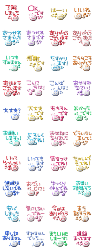 ぷっくりとした、カラフルなスマイルのあいさつスタンプです。