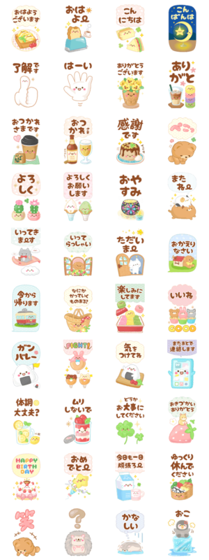 日常でよく使うフレーズをまとめました。 誰でも馴染みやすいようなかわいらしい小物や食べ物のイラストです。仕事や学校、ママ友間でも使いやすく敬語も多めになってます