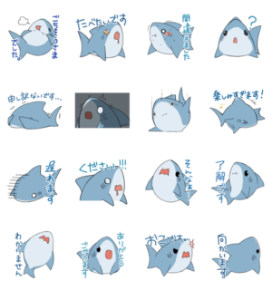 食べたものに変身するサメ『れおなるど』のスタンプ第3弾! 今回は変身しませんが、目上の方にも使える敬語スタンプになっています。UZNo より発売