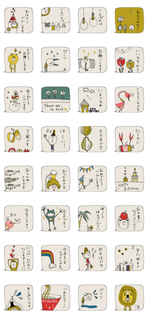 吹き出しの中にいろんな物語が♪おはよう/よろしく/了解/おつかれ/ありがとう/おやすみ/などよく使うスタンプのセットです。
