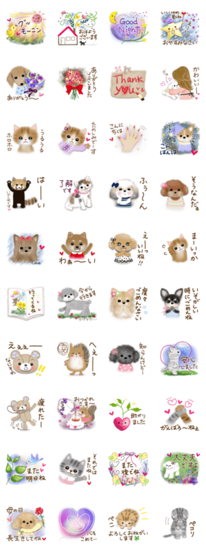 LINEトークの始めと終わりに使いやすい言葉と、基本挨拶のセットです。(よく使いそうな相槌や母の日スタンプも入っています)メルテュード より発売