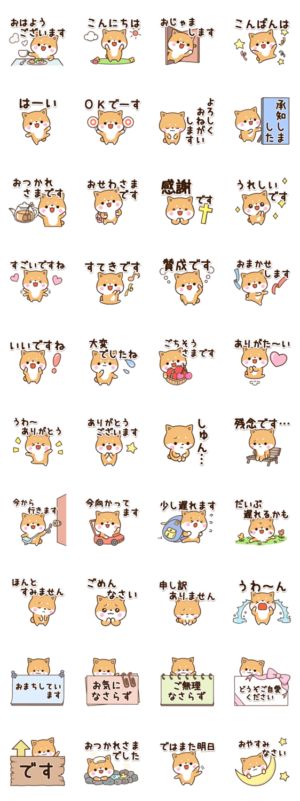 お茶目でかわいい、しばいぬのスタンプ。まちあわせや、毎日のあいさつ、基本的なものもあり、ずっと使えます。コーギーや秋田犬等の茶イヌが好きな方にもぜひ。【かたこ】