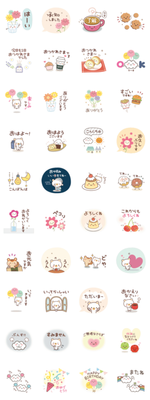 ふんわり可愛いイラストと、やさしいメッセージがうれしい「あいさつスタンプ」です。