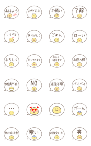黄色い顔絵文字がもちもち動くアニメーションスタンプです。毎日使える/可愛い/デカ文字/見やすい/無難/日常会話/連絡/挨拶/今から帰ります/体調不良/返信不要/熱中症/笑