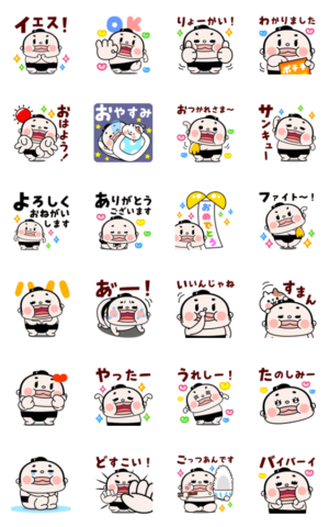 飛び出す!おすもーちゃんの楽しい挨拶スタンプ。やっぱお相撲さんって可愛いよー。毎日使える定番の挨拶と返事が揃ってます。お友達と楽しくドスコイ!!!!