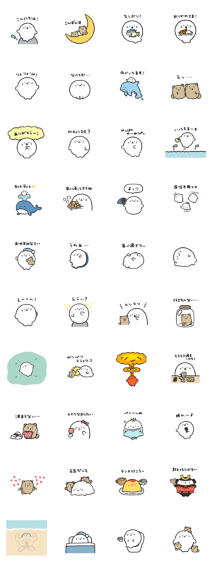 アザラシのまおちいスタンプ3。挨拶がちょっとだけ多めなスタンプ。め より発売