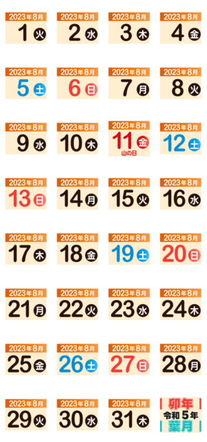2023年8月日付カレンダー スタンプ情報