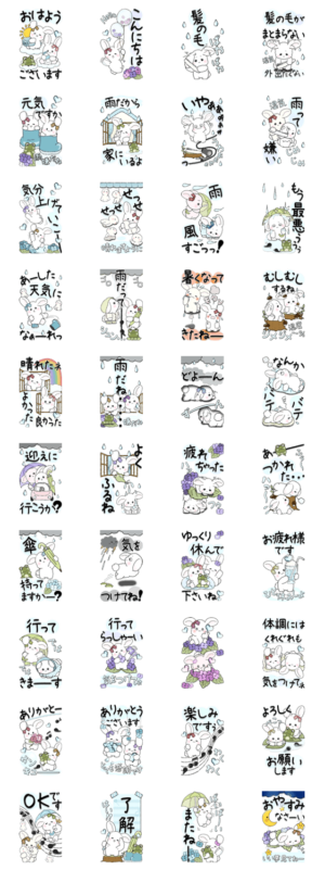 髪の毛もまとまらない・じめじめ雨が嫌いな白いうさぎさんです。雨の時期(梅雨とか)に使えるスタンプです。