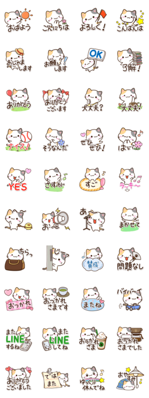 『小さい三毛猫』の『着せかえ』と『絵文字』もあります!かわいく楽しい雰囲気のミケネコあいさつスタンプ。ちいさい、みけねこやブチ猫好きな方にぜひ。【かたこ】