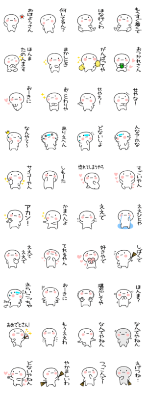 日常で無難に毎日使える関西弁を選びました。関西弁:かんさいべんをしゃべる「関西弁くん」スタンプです。しろくてまるいキャラクターです。(もるきゅた作)