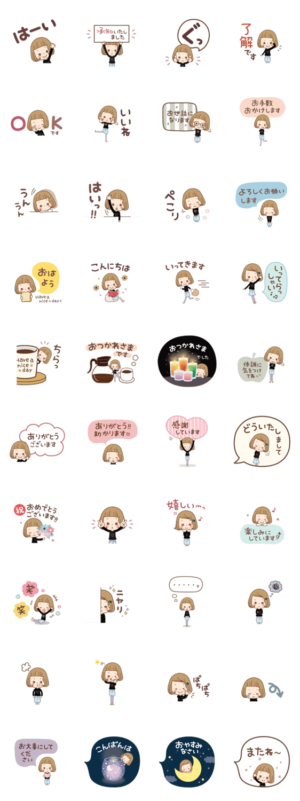 前髪短めな女の子の大人可愛い♡「敬語スタンプ」です。かりん より発売