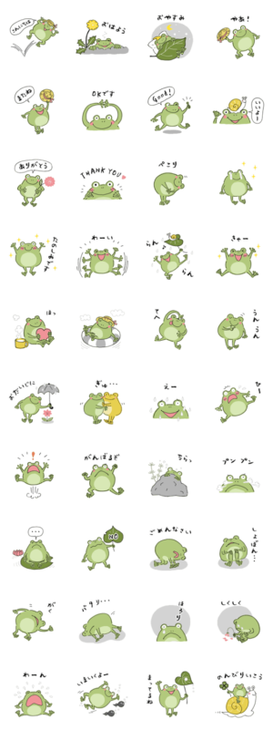 日々の出来事に使えるカエルのスタンプです。 アマガエル/ガマガエル/ヒキガエル/フロッグ/かえる/蛙つじむらあゆこ より発売