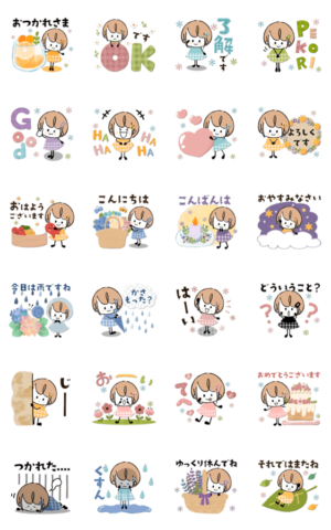 miniガールがカラフルチェックワンピースで元気に動きます!日常のあいさつや会話、梅雨の時期にも使えるスタンプセットです。