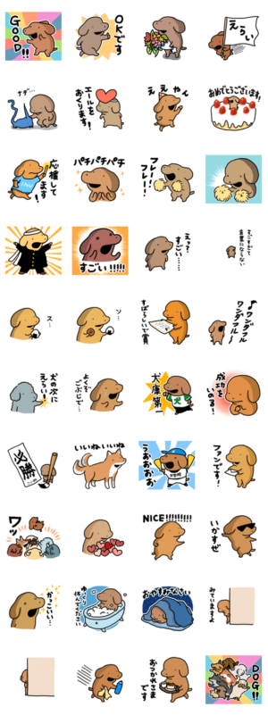 肯定的な言葉をたくさん言って応援してくれる犬たちのスタンプです。うかうか より発売
