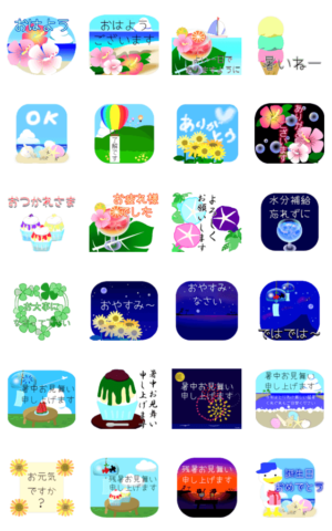暑中見舞い(7月7日~8月7日頃まで)、残暑見舞い(8月8日頃から8月末、遅くとも9月7日ごろまで)のスタンプに加えおはよう、おやすみなど敬語も含めてご用意しました。
