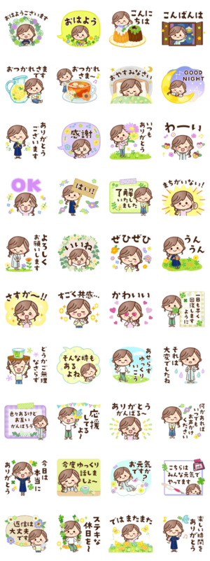 心ほっこり♡挨拶~共感・前向きになれるポジティブな声かけ、やさしい気づかいが入った女の子スタンプです♡春夏はもちろん年中OK!ありがとうや会話の終わりの言葉多め♡