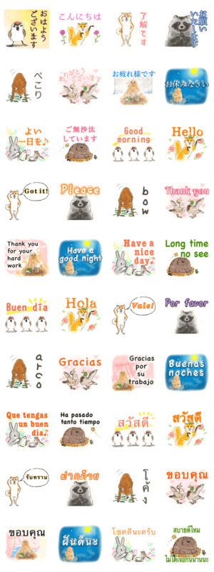 日本語、英語、スペイン語、タイ語と田舎の動物たちご挨拶スタンプです。カタコト含む!OSANPO-ZU より発売